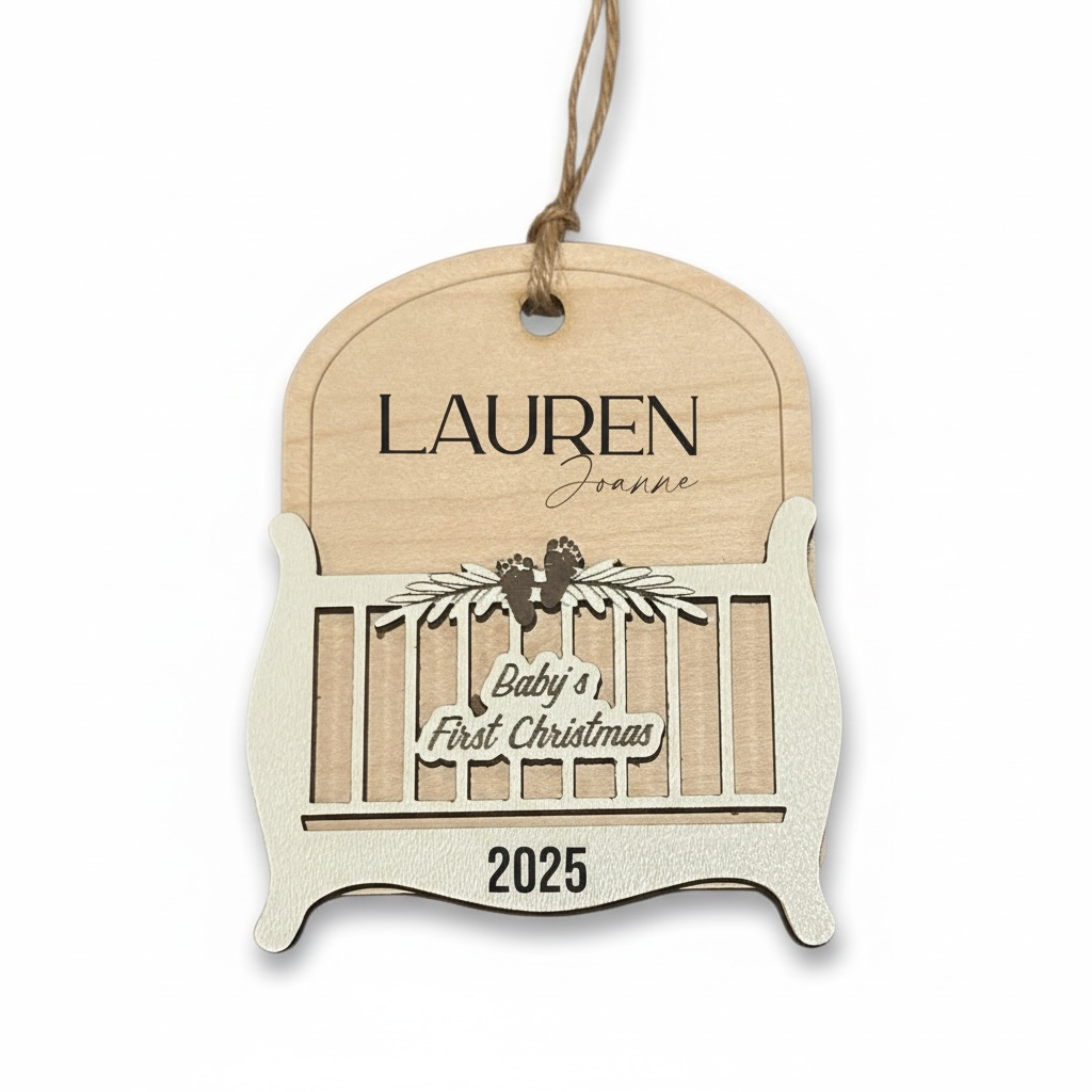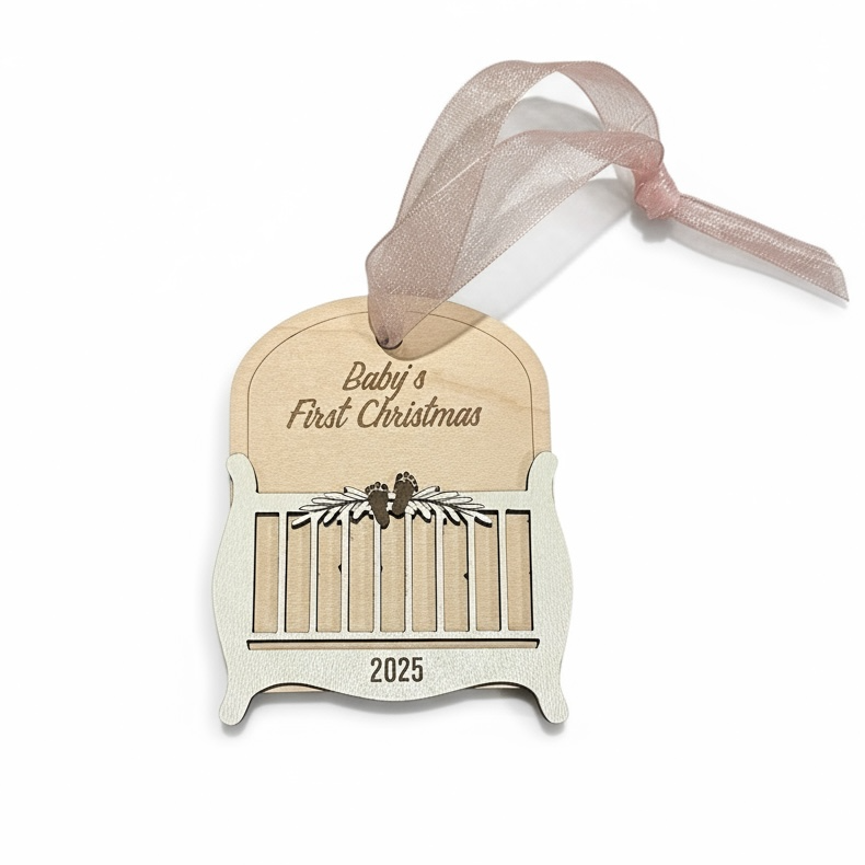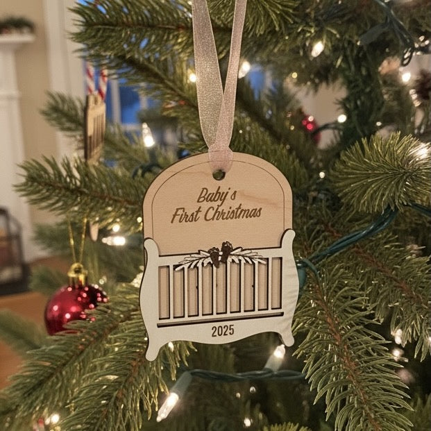 Celebrate a little one’s milestone with our Baby’s First Christmas Ornament. Crafted from beautiful maple plywood and white hardboard, this keepsake features an engraved crib design, a customizable year, and optional name personalization in your choice of two font combinations. Approximately 4" tall. A sweet heirloom for the tree.